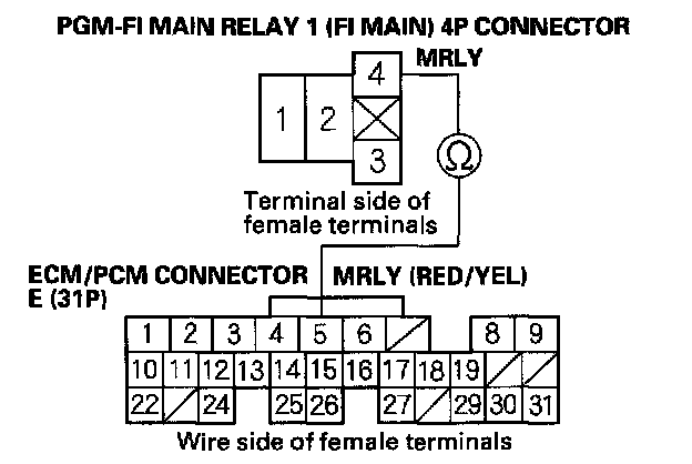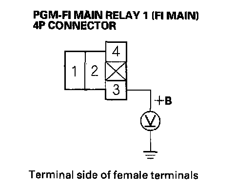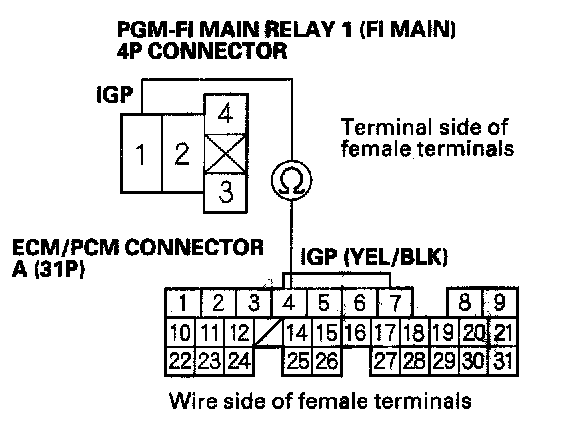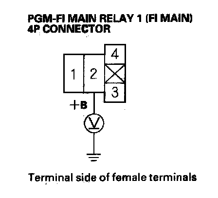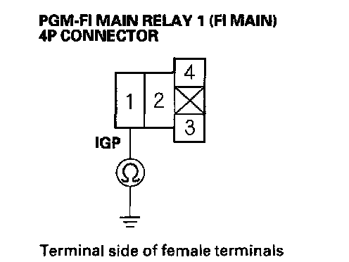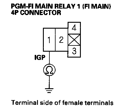 27. Check for continuity between body ground and PGM-FI main relay 1 (FI MAIN) 4P connector terminals No.2 and No.3 individually.