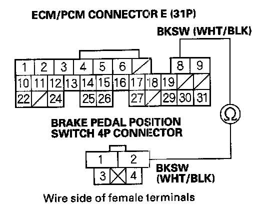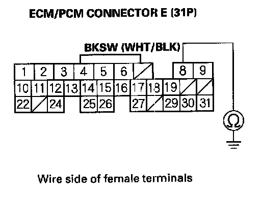 9. Check for continuity between ECM/PCM connector terminal E8 and brake pedal position switch 4P connector terminal No.2.