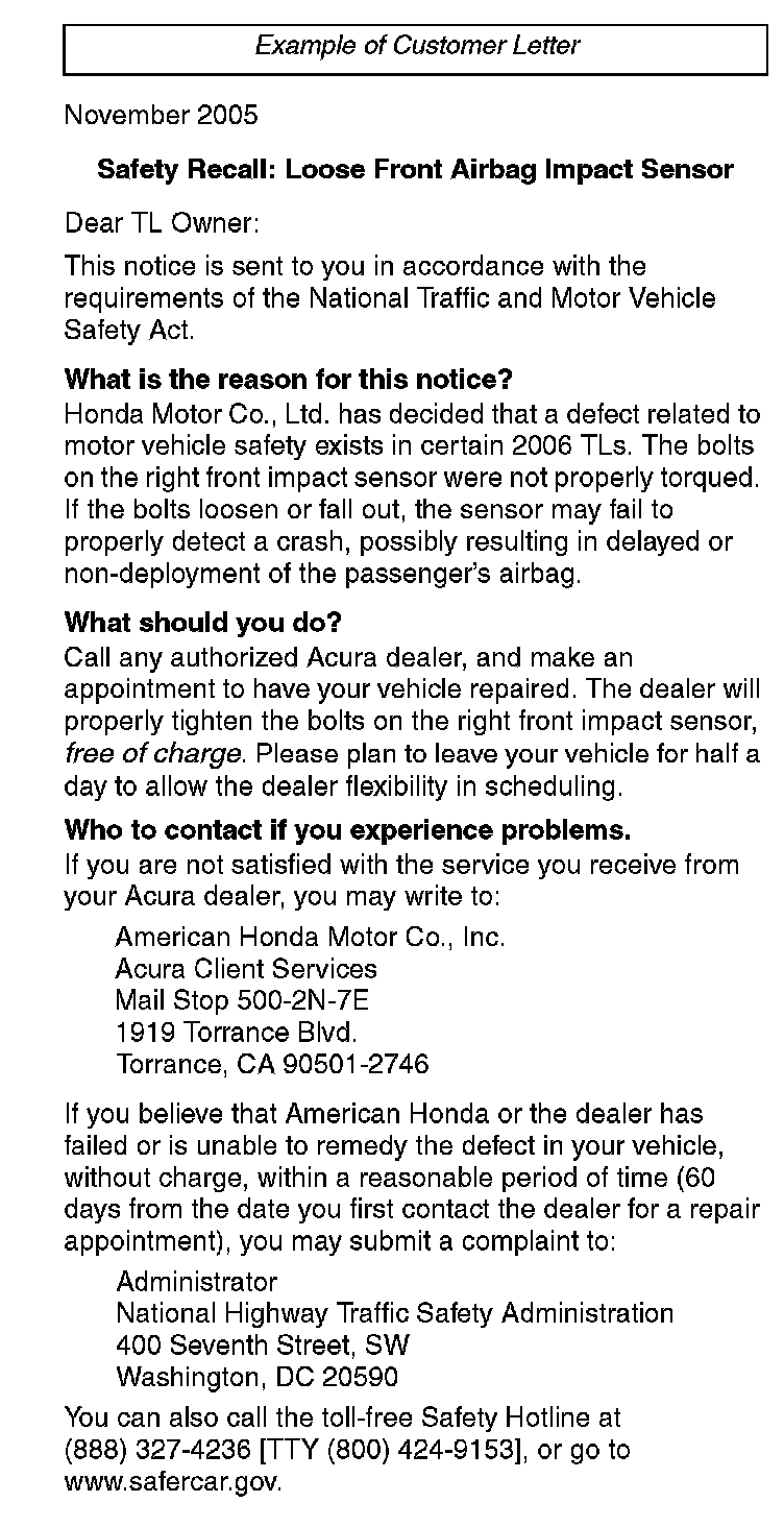 On some 2006 TLs, the bolts on the right (passenger's side) front impact sensor were not properly torqued. If the bolts loosen or fall out, the sensor may fail to properly detect a crash, possibly resulting in delayed or non-deployment of the passenger's airbag.