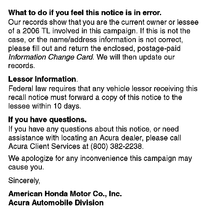 Some vehicles affected by this campaign may be in your new vehicle inventory. According to federal law, these vehicles cannot be sold or leased until they are repaired. To see if a vehicle is affected by this campaign, do a VIN status inquiry before selling it.