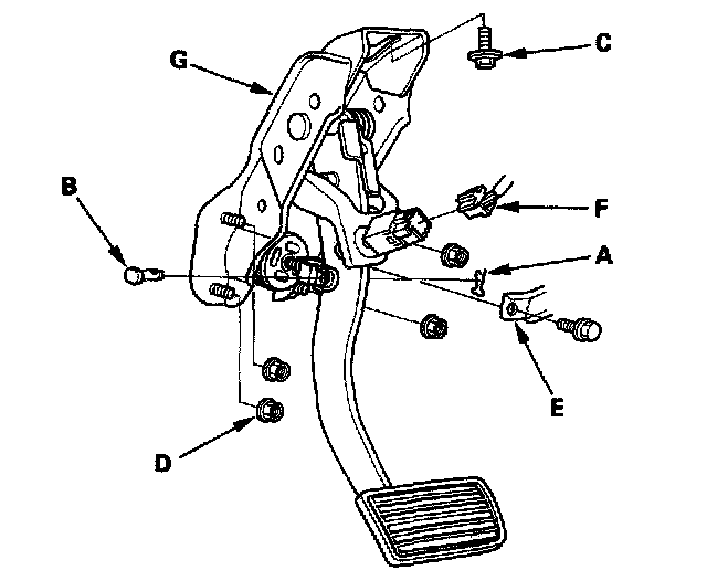 2. Remove the brake pedal bracket mounting bolt (C) and nuts (D).