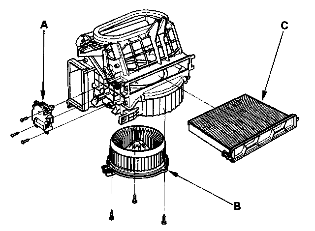 - The recirculation control motor (A), the blower motor (B), and the dust and pollen filter (C) can be replaced without removing the blower unit.
