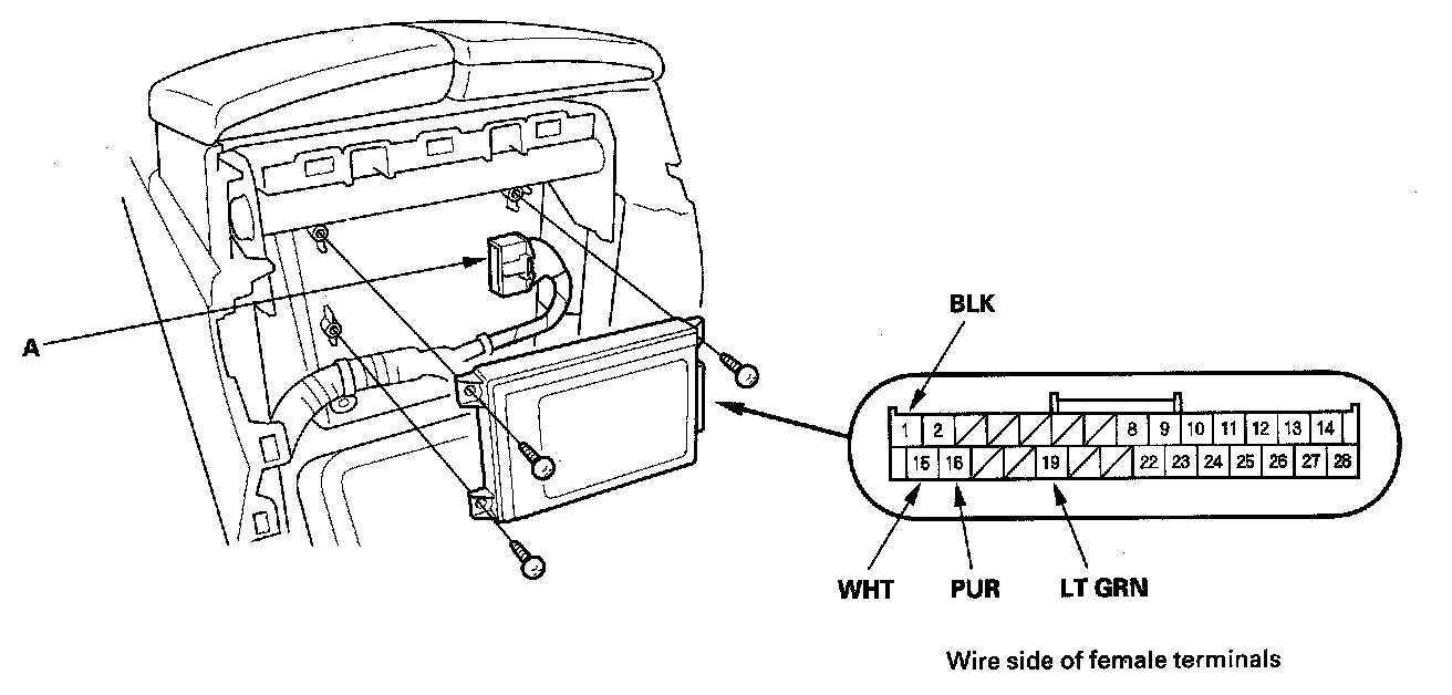 2. Disconnect the 28P connector (A) from the HandsFreeLink control unit (B).