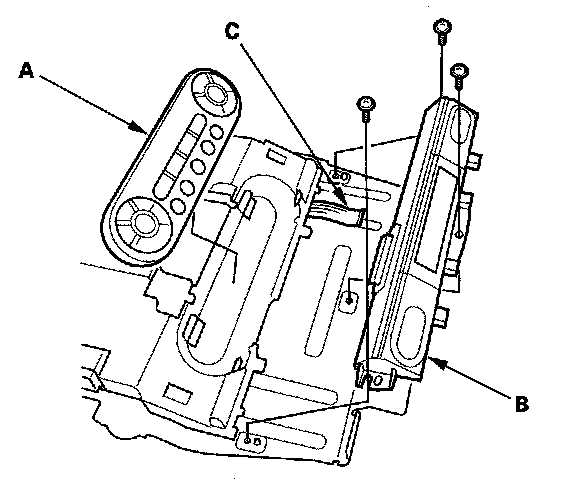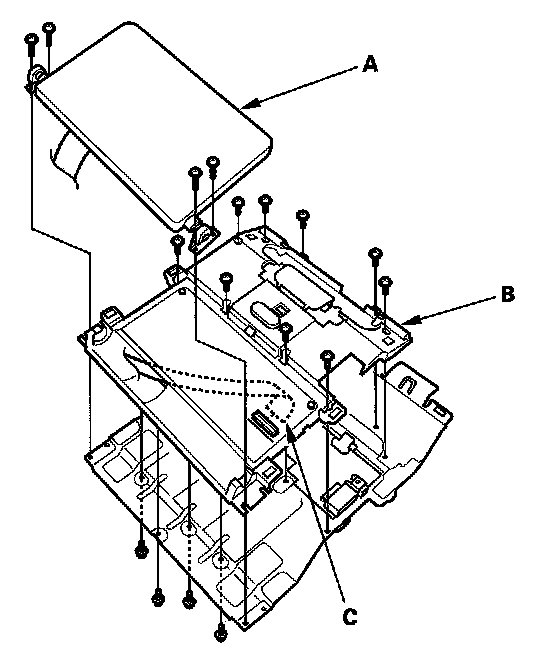 7. Remove the screws, then remove the screen (A) and base (B). Disconnect the cable (C).