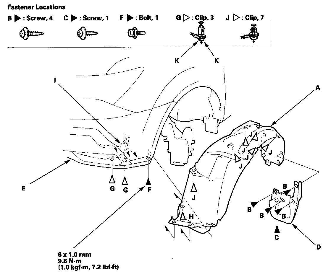3. From the wheel arch, remove the clips (H) securing the front splash shield (I) and front inner fender, and remove the clip (J) securing the front inner fender on the body.