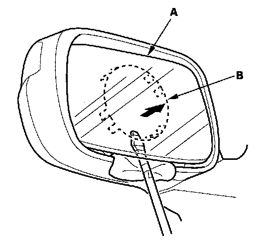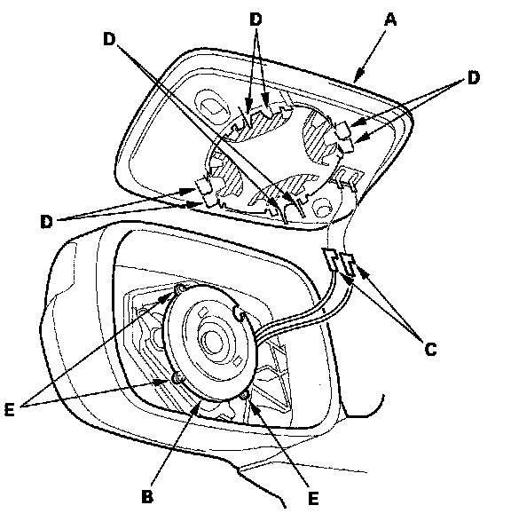 5. Separate the mirror holder (A) from the actuator (B). Disconnect the mirror defogger connectors (C) from the heater pad terminals.