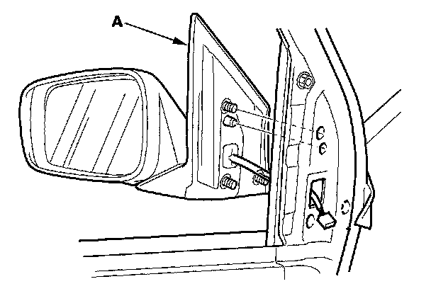 3. While holding the mirror (A), pull back the door weatherstrip (B) as needed, then remove the nuts.