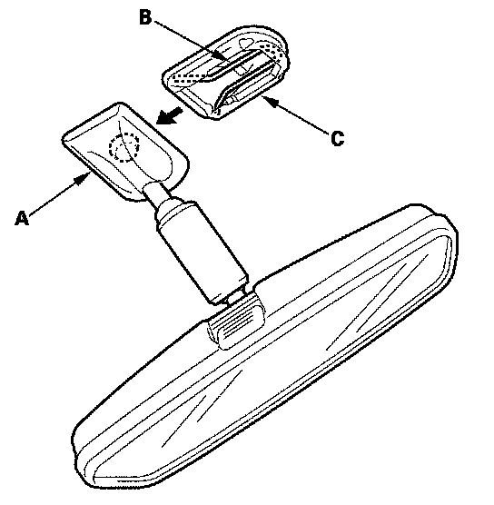 2. Slide the rearview mirror (A) down toward the bottom of the windshield to detach it from the spring (B) in the mount (C).