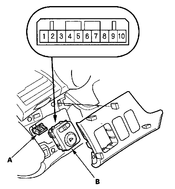 2. Disconnect the 10P connector (A) from the power mirror switch (B).