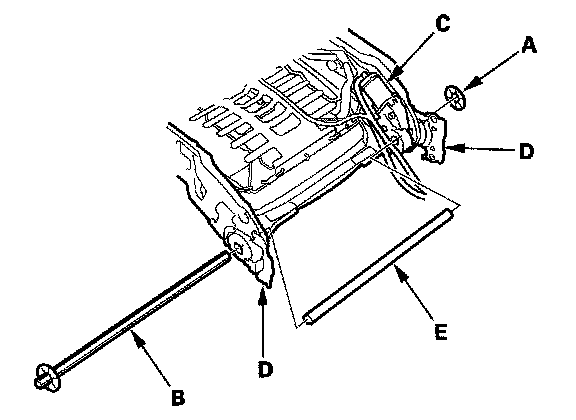 4. Release the push nut (A) from the motor side end of the connecting rod (B), gently tap on the motor side of the connecting rod to remove it from the recline motor (C) and both recline adjusters (D).