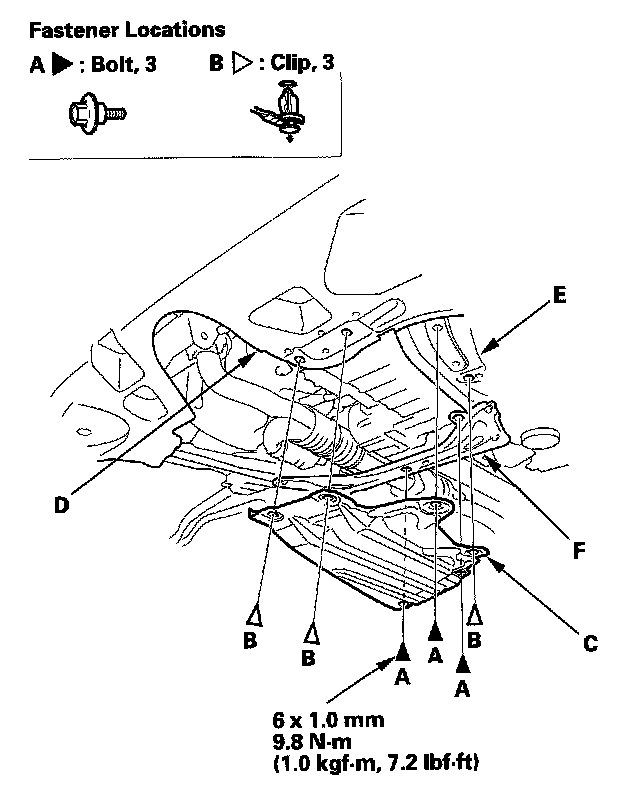1. Remove the bolts (A), and clips (B), then remove the front undercover (C) from the splash shield (D), front suspension subframe (E), and front subframe stiffener (F).