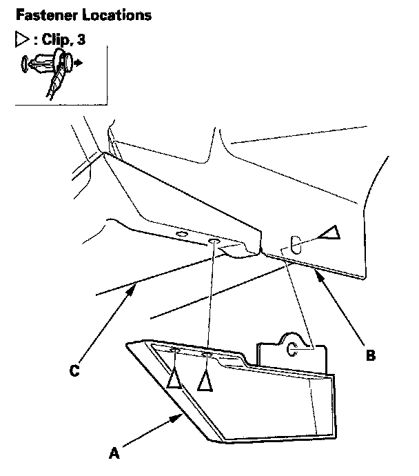 Rear Strake Replacement1. Remove the clips, then remove the rear strake (A) from the rear fender cover (B) and side sill panel (C).