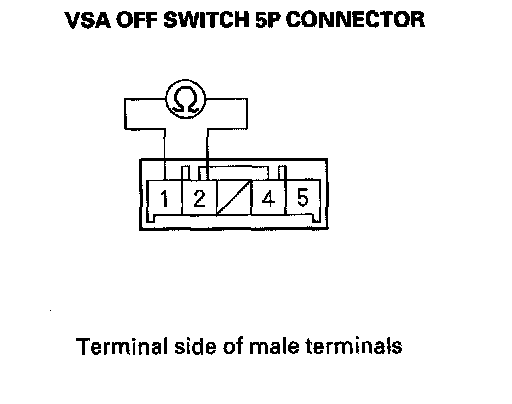 4. Check for continuity between the VSA OFF switch 5P connector terminal No. 1 and No. 2. There should be continuity when the switch is pressed, and no continuity when the switch is released.