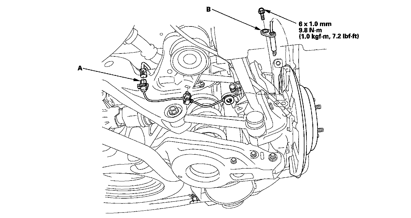2. Remove the clip (A), then disconnect the wheel sensor connector (B).