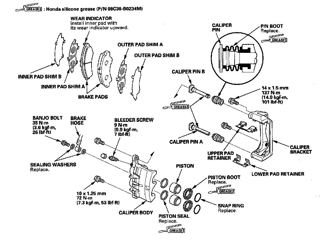 Front Brake Caliper OverhaulCAUTION: Frequent inhalation of brake pad dust, regardless of material composition, could be hazardous to your health.