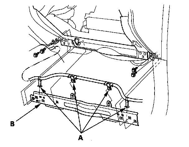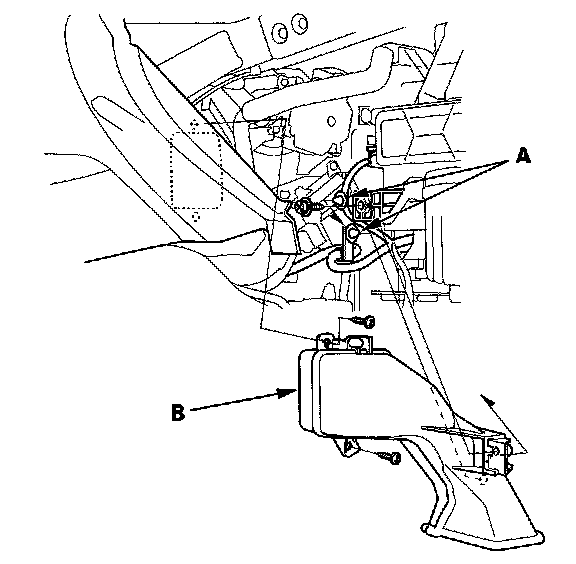 4. Remove the wire harness clips (A), the self-tapping screws, and the passenger's heater duct (B).