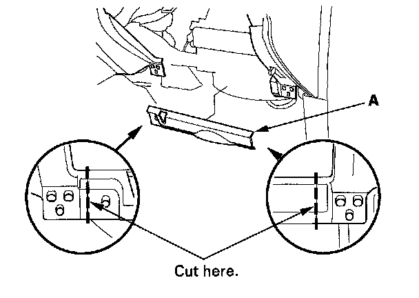 3. Cut the plastic cross brace (A) in the glove box opening with diagonal cutters in the area shown, and discard it.