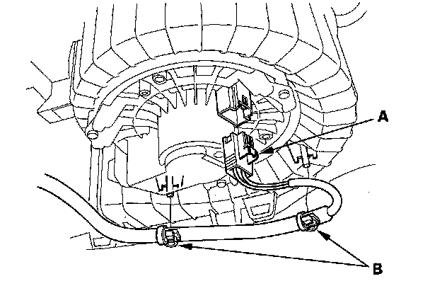 5. Disconnect the connector (A) from the front blower motor. Remove the wire harness clips (B).