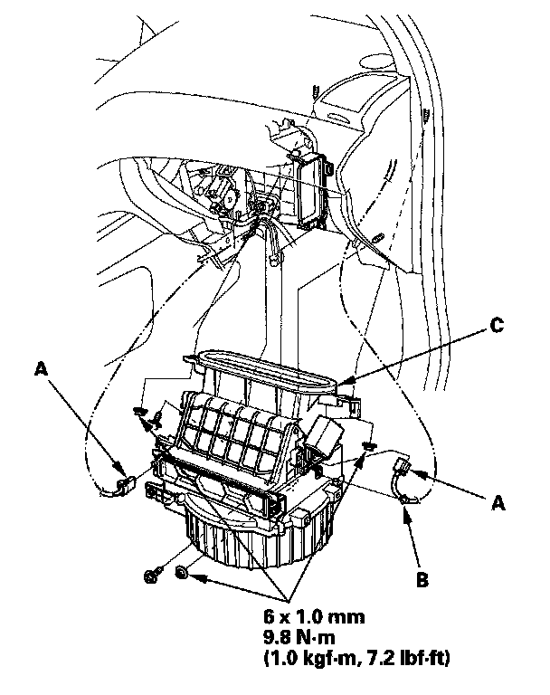 6. Disconnect the connectors (A) from the recirculation control motor and adaptive front lighting control unit, then remove the harness clip (B). Remove the self-tapping screws, the mounting nuts, and the blower unit (C).