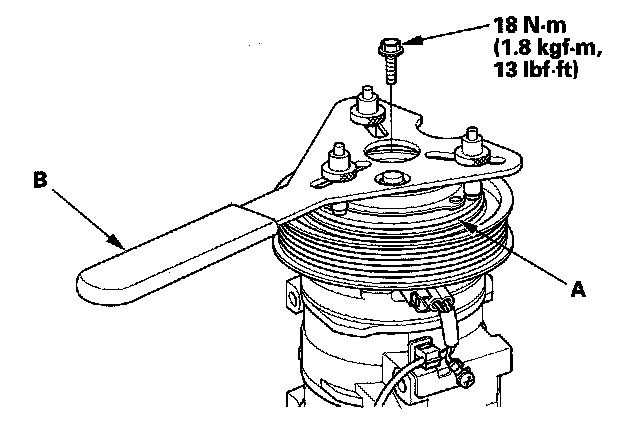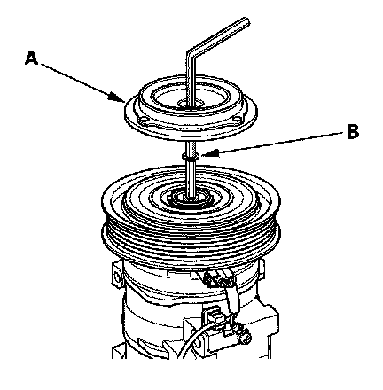 1. Remove the center bolt while holding the pressure plate (A) with a commercially available A/C clutch holder (B).