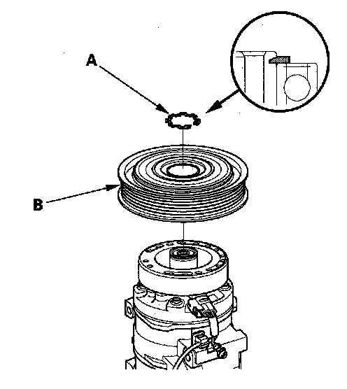 3. If you are replacing the field coil, remove the snap ring (A) with snap ring pliers, then remove the pulley (B). Be careful not to damage the pulley or the A/C compressor.