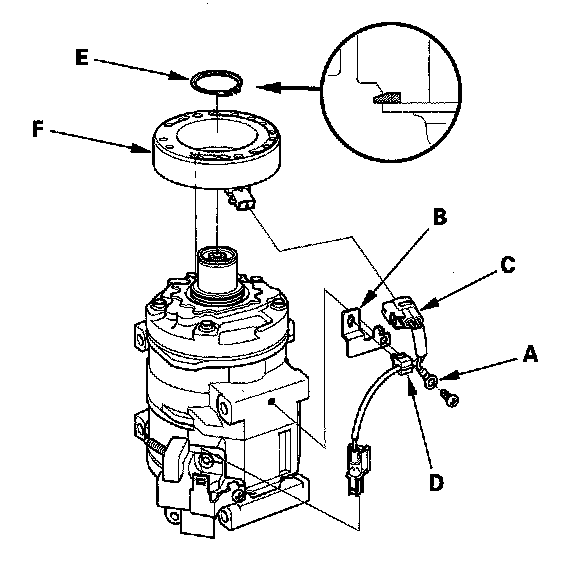 4. Remove the screw from the field coil ground terminal (A) and bracket (B). Disconnect the connector (C) from the field coil, then remove the wire harness clip (D). Remove the snap ring (E) with snap ring pliers, then remove the field coil (F). Be careful not to damage the field coil or the A/C compressor.