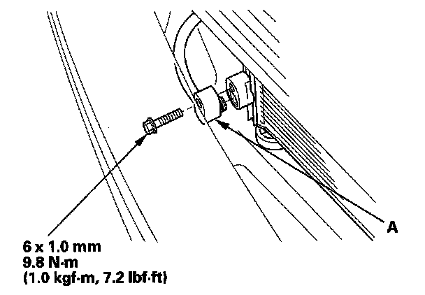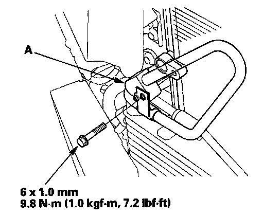 3. Remove the bolt, then disconnect the discharge hose (A) from the A/C condenser.