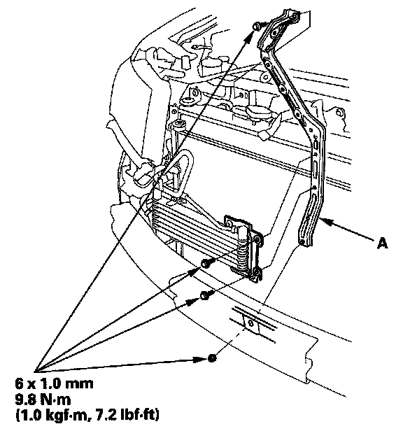 5. Remove the bolts, nut, and the ATF cooler bracket (A).