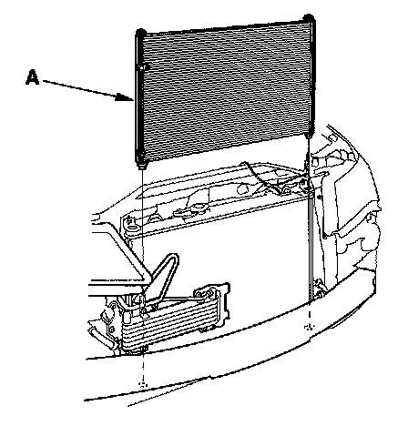 8. Remove the A/C condenser (A) by lifting it up. Be careful not to damage the radiator and A/C condenser fins when removing the A/C condenser.