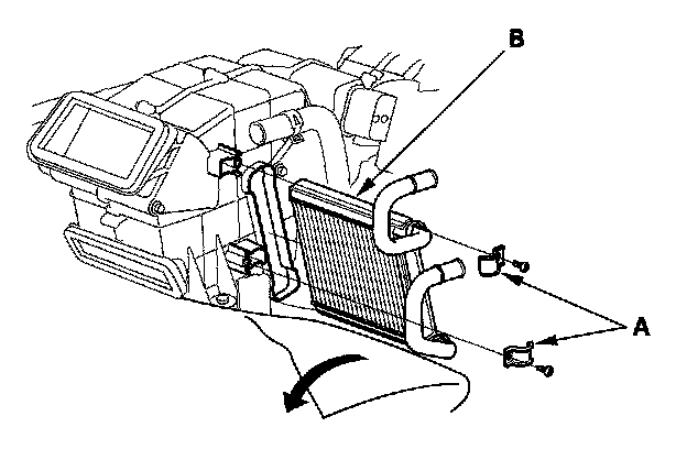 4. Turn over the carpet. Remove the self-tapping screws and the clamps (A). Carefully pull out the rear heater core (B) without bending lines.