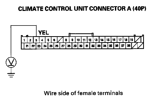3. Measure the voltage between climate control unit connector A (40P) terminal No. 3 and body ground.