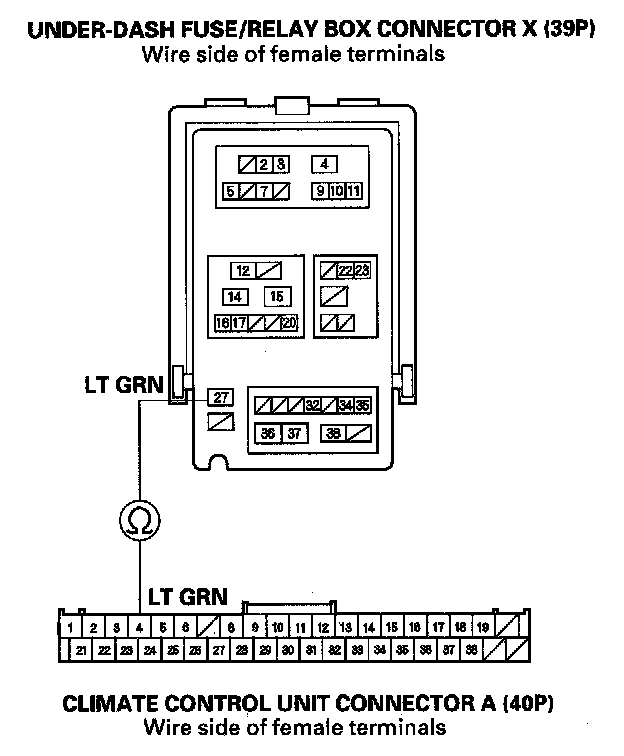 8. Check for continuity between under-dash fuse/relay box connector X (39P) terminal No. 27 and climate control unit connector A (40P) terminal No. 4.