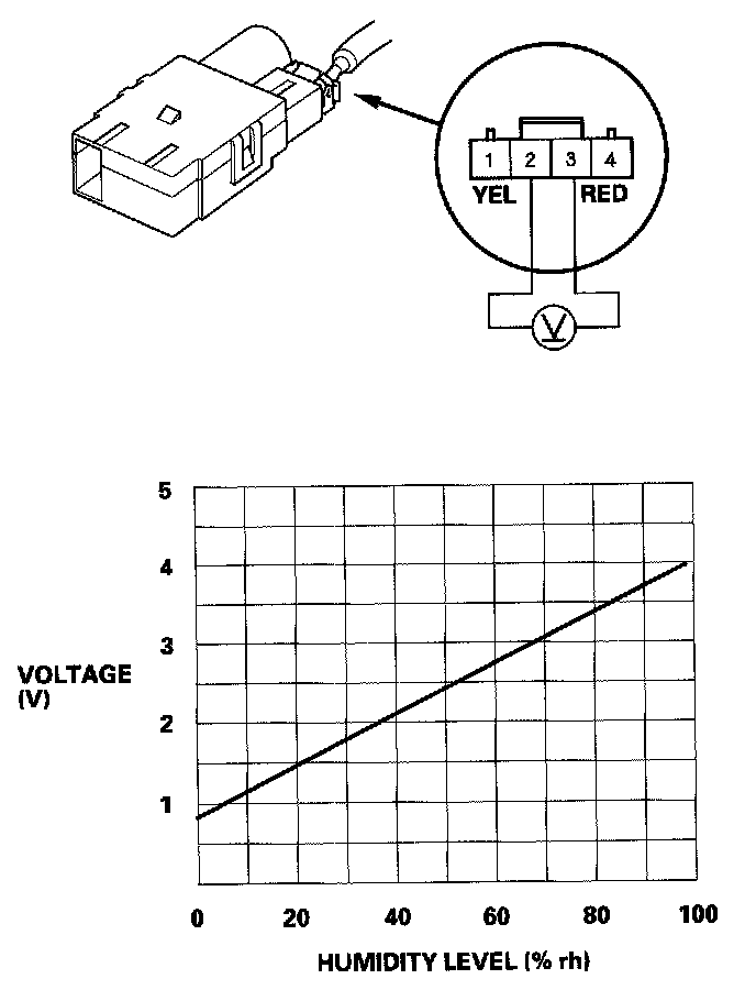 4. If the voltage is not as specified, replace the humidity/in-car temperature sensor.