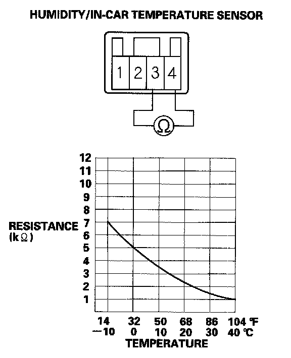 4. Compare the resistance reading between the No. 4 and No. 3 terminals of the humidity/in-car temperature sensor with the specifications shown in the graph; the resistance should be within the specifications.