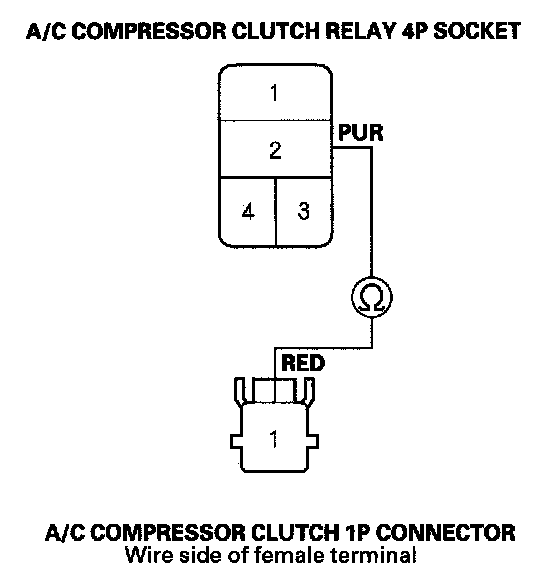 21. Check for continuity between the A/C compressor clutch relay 4P socket terminal No. 2 and the A/C compressor clutch 1P connector terminal No. 1.