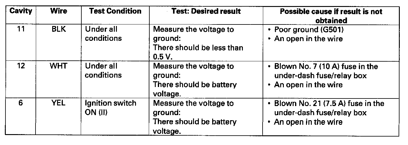 6. Reconnect the connector to the electrical compass unit, turn the ignition switch ON (II) and perform the following input tests at the connector.