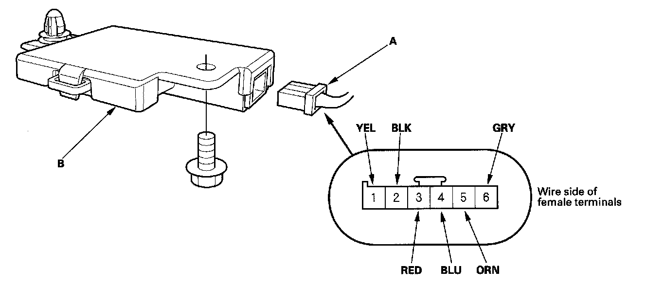 2. Disconnect the 6P connector (A) from the electrical compass unit (B).