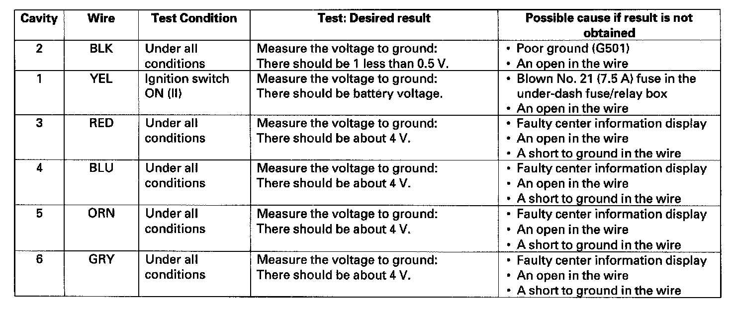 4. Reconnect the connector to the electrical compass unit, turn the ignition switch ON (II) and perform the following input tests at the connector.