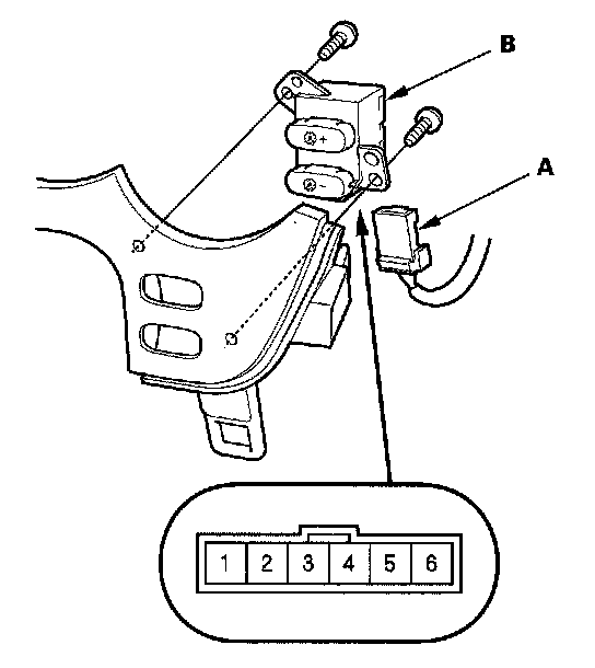2. Disconnect the 6P connector (A) from the dash lights brightness controller (B).