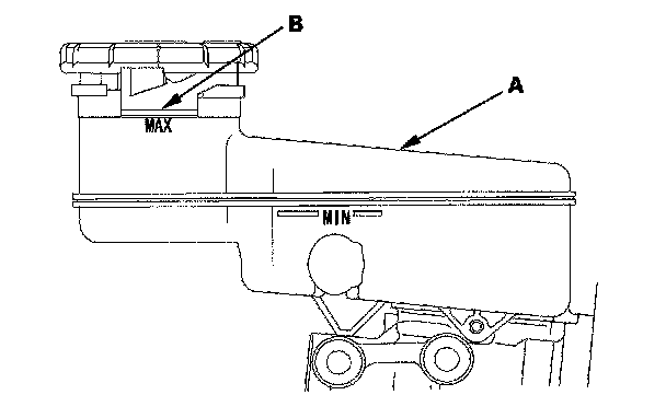 1. Make sure the brake fluid level in the reservoir (A) is at the MAX (upper) level line (B).