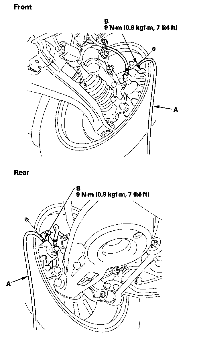 4. Attach a length of clear drain tube (A) to the bleed screw (B), then, loosen the bleed screw to allow air to escape from the system. Then tighten the bleed screw securely.