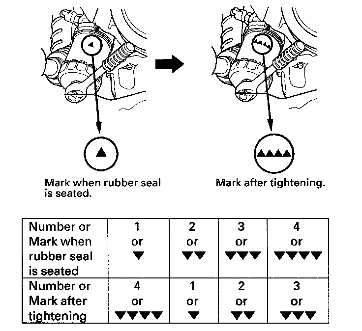 ^ Tighten the filter by turning it clockwise three numbers or marks from the one you noted. For example, if mark V is at the bottom when the seal is lightly seated, tighten the filter until the mark VVVV comes around to the bottom.