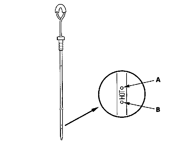 5. Remove the dipstick and check the fluid level. It should be between the upper mark (A) and lower mark (B).