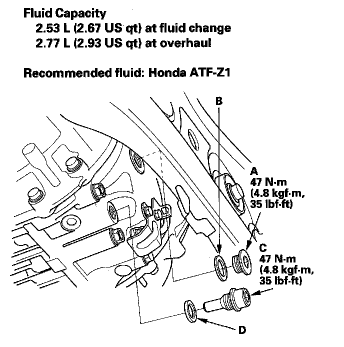 3. Remove the drain plug (C) and the sealing washer (D) and drain the fluid.