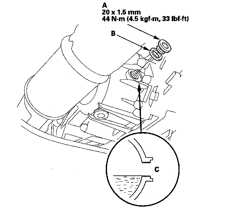 8. Refill the transfer assembly with the recommended fluid (hypoid gear oil) through the filler hole (C) until the fluid flows out. Use an SAE 90 or SAE 80W-90 viscosity hypoid gear oil, API classified GL4 or GL5 only.
