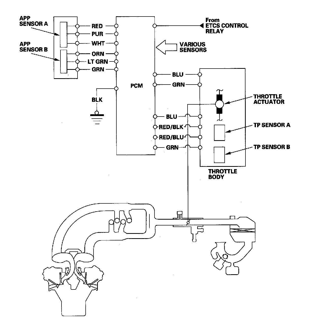 The electronic throttle control system consists of the throttle actuator, throttle position (TP) sensor A/B, accelerator pedal position (APP) sensor A/B, electronic throttle control system (ETCS) control relay, and the PCM.