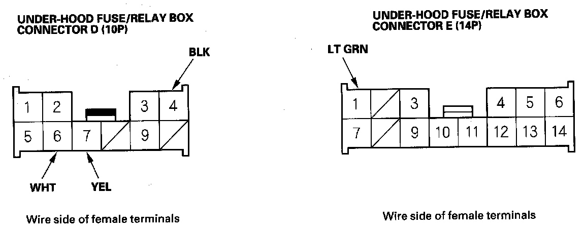 3. Disconnect the under-hood fuse/relay box connectors D (10P) and E (14P).