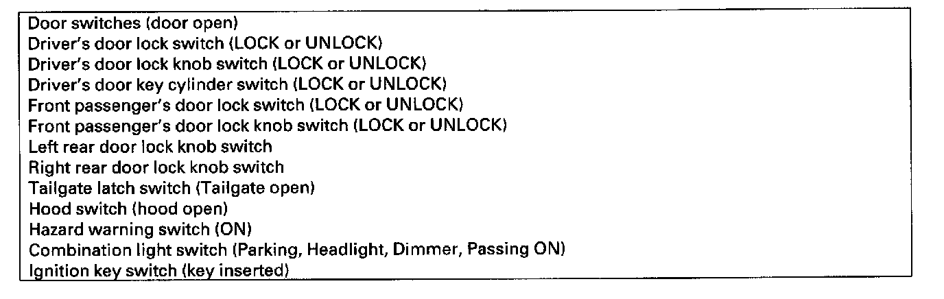 NOTE: If any control unit is faulty and will not wake up, several circuits in the system will malfunction at the same time. In the table below, the control unit is followed by a list of the switches and input signals that can wake it up.