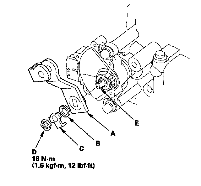 17. Install the new lock washer (A) over the control shaft (B) with aligning the projection (C) of the lock washer with the N positioning line (D) on the transmission range switch (E) and install the locknut (F).