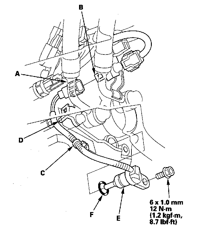 7. Remove the ATF temperature sensor (E) and replace the sensor.